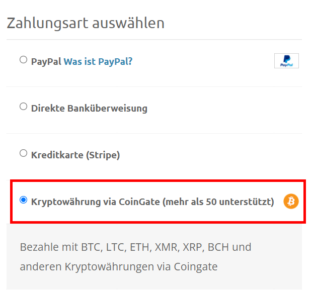 Bezahlen kannst Du via CoinGate mit BTC, LTC, ETH, XMR, XRP, BCH und anderen Kryptowährungen.